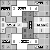 ![]() | The grid of the Killer Sudoku is covered by cages (groups of cells), marked with dotted outlines. Each cage encloses 2 or more cells. The top-left cell is labeled with a cage sum, which is the sum of all solution digits for the cells inside the cage. Killer Sudoku Rules: